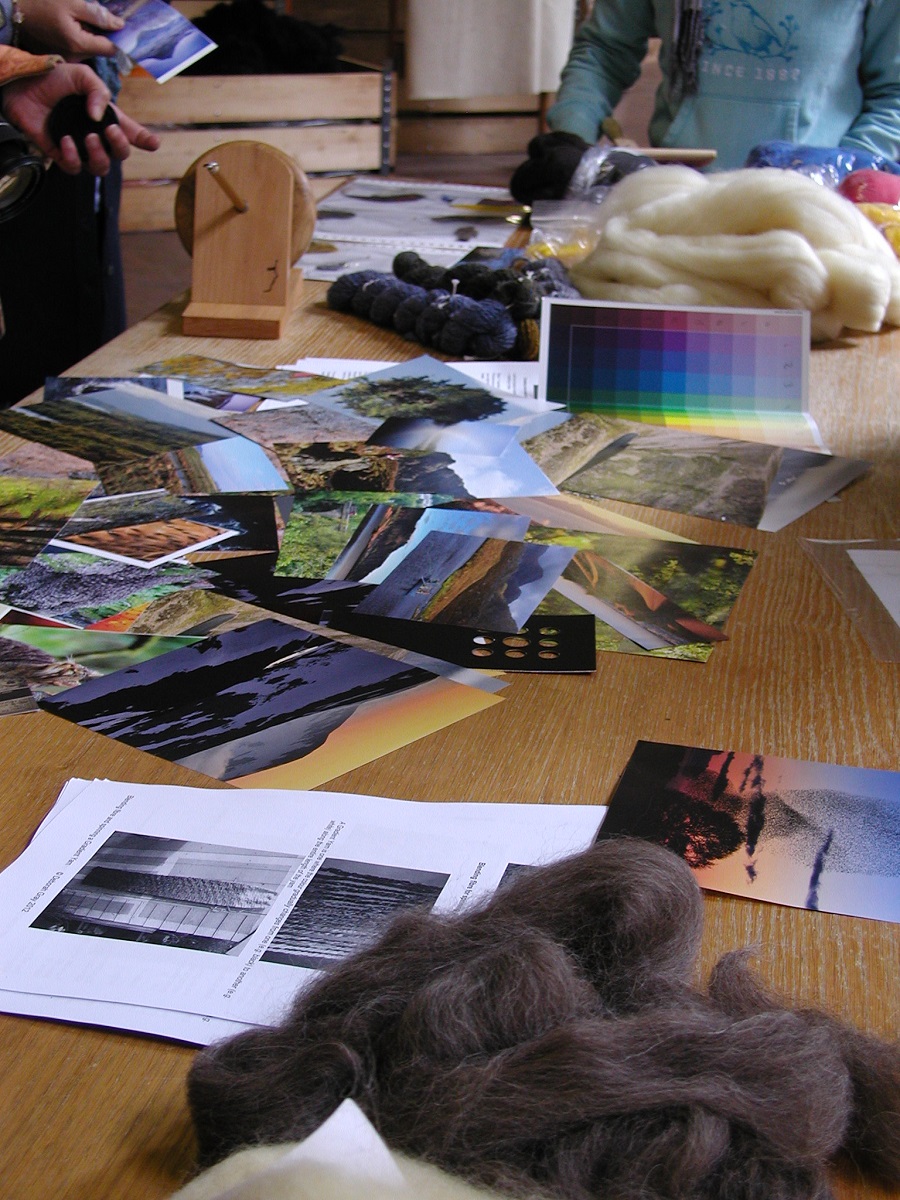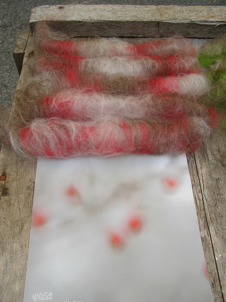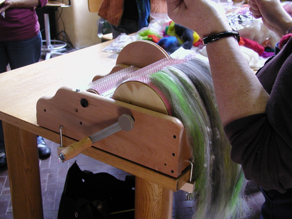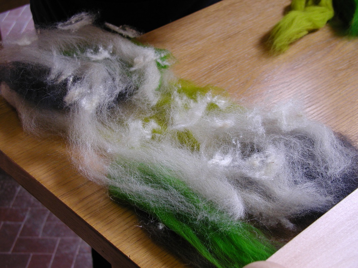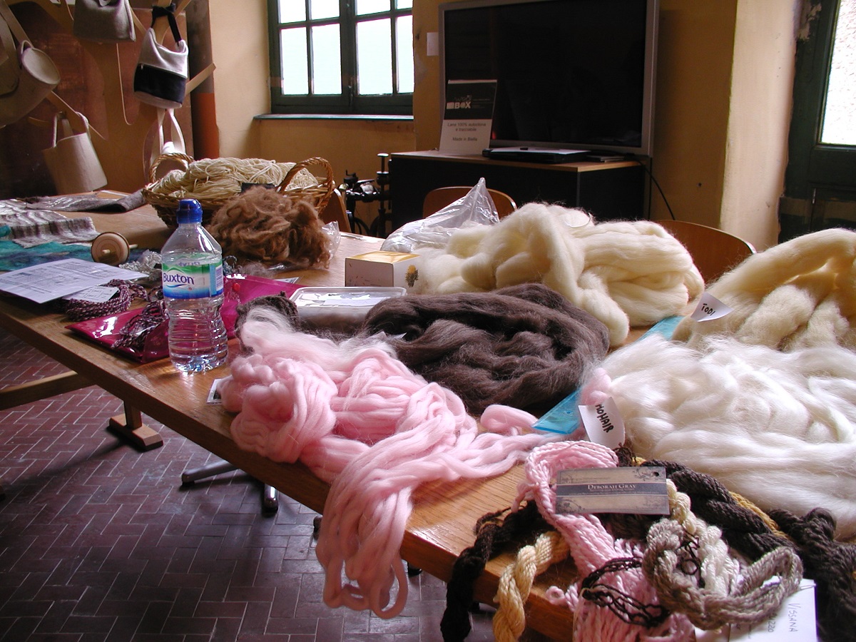 - how to make multi-colored yarns: for me, the most intriguing part of the workshop! It hasn’t been easy at all, and at a certain point I felt myself so depressed! How can it be, I told to myself, that I always loved colors so much, and I have from EVER such an intimate and friendly relationship with them, how can it be that I CAN’T understand HOW TO blend fibers to achieve a specific final color? Or, better saying, SETS, oh no, more better, FLOWER BEDS of final colors – considering my passion for fancy yarns which essentially are “collages” of so many different colors? But Deborah was right: first of all things that have to be done, GET INSPIRED. Photographs are fundamental. So strange I never thought about this. And then, another extremely important step: LOOK AT THEM CAREFULLY, paying great attention to everything you see in them. Become aware of the colors and the way they interact: the amount of one particular color, the amount of another particular one, the way they are put together – if in sequence, arranged in blots, or blended one into the other, if some colors are effectively linked together or maybe there is another color put in between them to create that singular, intriguing effect and appeal. And then, well, let’s begin with fibers! Take a little bit of this one, a little bit of that one, and a pinch of the other one and… voilà! The multicolored yarn has been created! VERY interesting INDEED. HIGHLY EXCTING, indeed. And this process to create multicolored yarns HAS BEEN A REVELATION to me. Because it’s following this kind of process that yarns that are REALLY “new” can be produced. let me to explain: when I took in my hands the merino wool tops (so vibrant in their splendid colors!!!) which Deborah brought us to be used for our experiments, I literally plunged into them, took them and blended them with enjoyment and satisfaction, I really couldn’t stop carding and carding, one batt after another. And what a beautiful result I obtained, at once, with no problems at all. BUT… INDEED, there was a problem! I mean, when ALREADY COLORED YARN are available, it’s pure joy&fun to put them together to create… new colors (matches), but what happens to me at last is that, all right, I create color arrangements which are interesting, but well, let’s say it, so very predictable. That’s why colors of the fibers I use from the start are always the same, so in the end are always the same arrangements I make (and I make these arrangements always in the same way, choosing from the same colors and matching the same kind of shades in the same way). That is, as I LOVE bright, intense colors, my choice almost always fall on them only! But not only vibrant colors do exist. BIG EGLE! Learning how to manage OTHER types of colors, OTHER styles, which are different from your favorites but anyhow, anyway new and intriguing, is IMPORTANT. That’s why, when I chose my inspirational photos, I chose images with colors I WANTED DIFFERENT: colors which had to be NEW to me and my usual taste. And oh, WHAT A THRILL when I understood HOW TO create yarns that followed those particular color combinations! Hooray BIG egle, you’ve done it at last ^_^