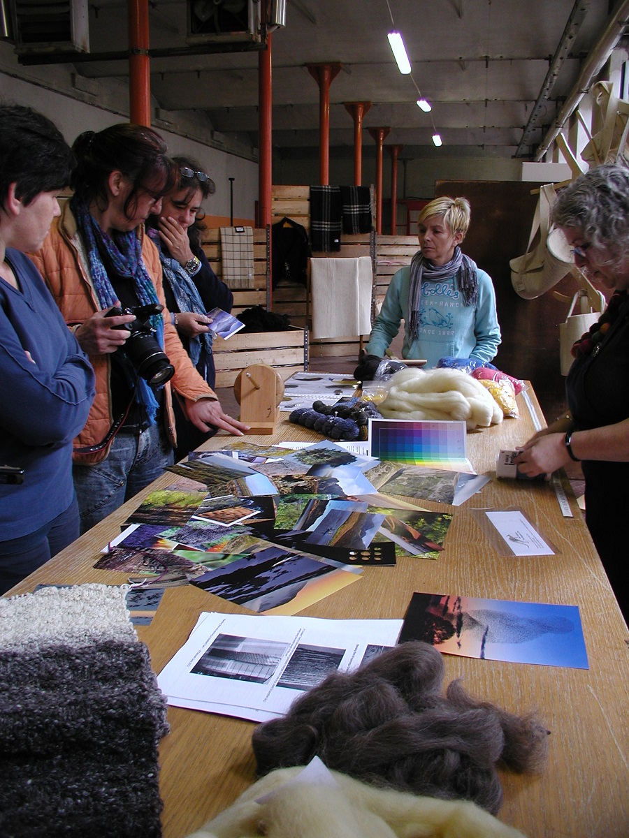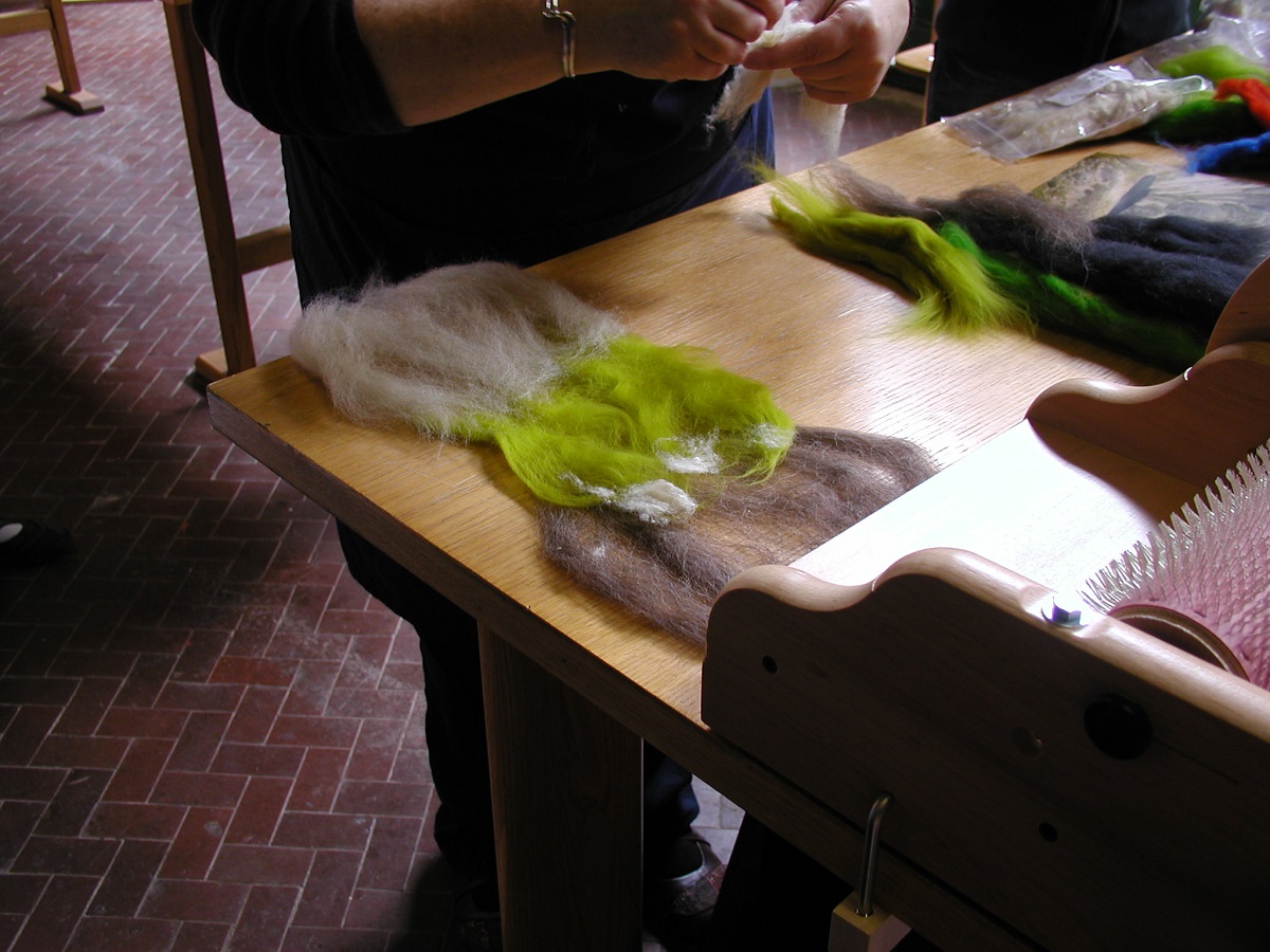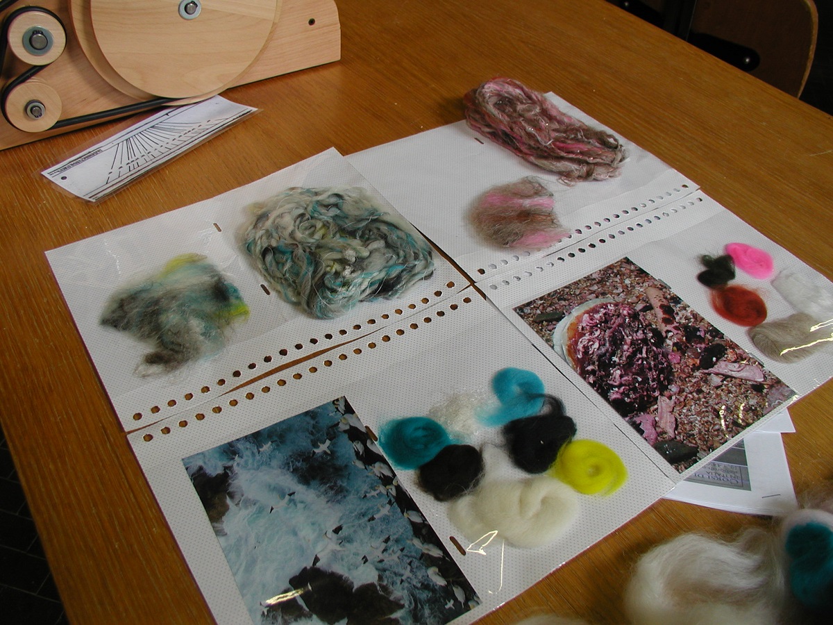 - come creare filati a più colori: la parte che ho trovato più intrigante! Non è stato per niente FACILE, e sono andata in crisi… Ma come, mi dicevo, io che da sempre amo profondamente i colori, e ho con loro un rapporto così intimo e amichevole, NON RIESCO a capire COME si fa a mescolare le fibre per ottenere un determinato colore finale? O meglio, INSIEMI, no ancora meglio, AIUOLE di colori finali, vista la mia passione per i filati fantasia che sono “collage” di tanti colori diversi? Ma Deborah aveva ragione: prima cosa da fare, PRENDERE ISPIRAZIONE. Avere delle fotografie sottomano è fondamentale. Che strano, io non ci avevo mai pensato. Poi, cosa importantissima: OSSERVARLE MOLTO BENE. Rendersi conto dei colori che contengono, e di come interagiscono fra di loro: la quantità di un tale colore, la quantità di un altro, il modo in cui sono accostati, se in sequenza oppure a macchie oppure sfumati l’uno nell’altro, se alcuni colori sono effettivamente vicino l’uno all’altro oppure c’è un altro colore a mettersi fra loro e a creare, diciamo, “l’atmosfera”. E poi si comincia. Si prende un pizzico di quella lana, un pizzico di questa, uno zinzino di quell’altra et… voilà! Il filato colorato eccolo qua! MOLTO interessante. ECCITANTISSIMO. E questo processo di creazione di filati colorati E’ STATA UNA VERA RIVELAZIONE. Perché è seguendo questo procedimento che si realizzano filati davvero “nuovi”. Vi spiego: quando ho avuto sotto mano i tops di lana merino colorati (un SACCO di colori stupendi!!!) che Deborah ci aveva portato per i nostri esperimenti, mi ci sono tuffata sopra a pesce, li ho mescolati insieme con gusto e soddisfazione, senza riuscire a fermarmi! E che bel risultato ho ottenuto, subito, senza problemi. MA… un problema effettivamente c’era! Cioè, quando SI HANNO sottomano i colori già pronti, è uno spasso metterli insieme per creare… colore, ma alla fine io… finisco sempre per creare giochi di colore interessanti, ma diciamo… alla fine un po’ scontati. Perché i colori sono sempre quelli, nulla si crea nulla si distrugge, insomma si finisce per avere tra le mani sempre le stesse sfumature, sempre gli stessi accostamenti.Figuriamoci per me, che adoro i colori forti e sgargianti! Ma non esistono solo questi. Eglona! Imparare a gestire ALTRI TIPI di colore, ALTRI STILI, diversi dai preferiti ma pur sempre intriganti e NUOVI, è IMPORTANTE. Ecco perché, quando ho scelto le mie foto, ho scelto delle immagini con colori VOLUTAMENTE differenti, per me insomma NUOVI. E CHE EMOZIONE, capire COME fare per realizzare dei filati che ricalcassero quegli effetti cromatici! Brava Eglona ce l’hai fatta, sono fiera di te ^_^