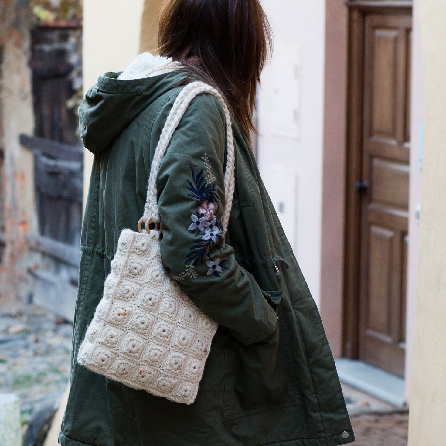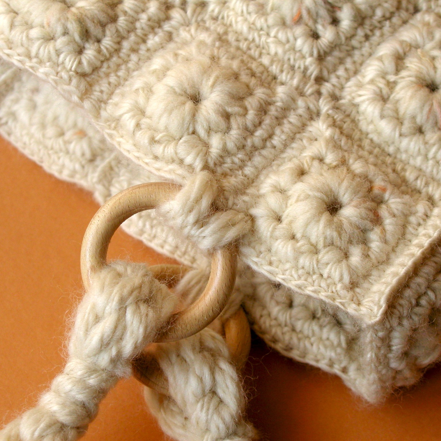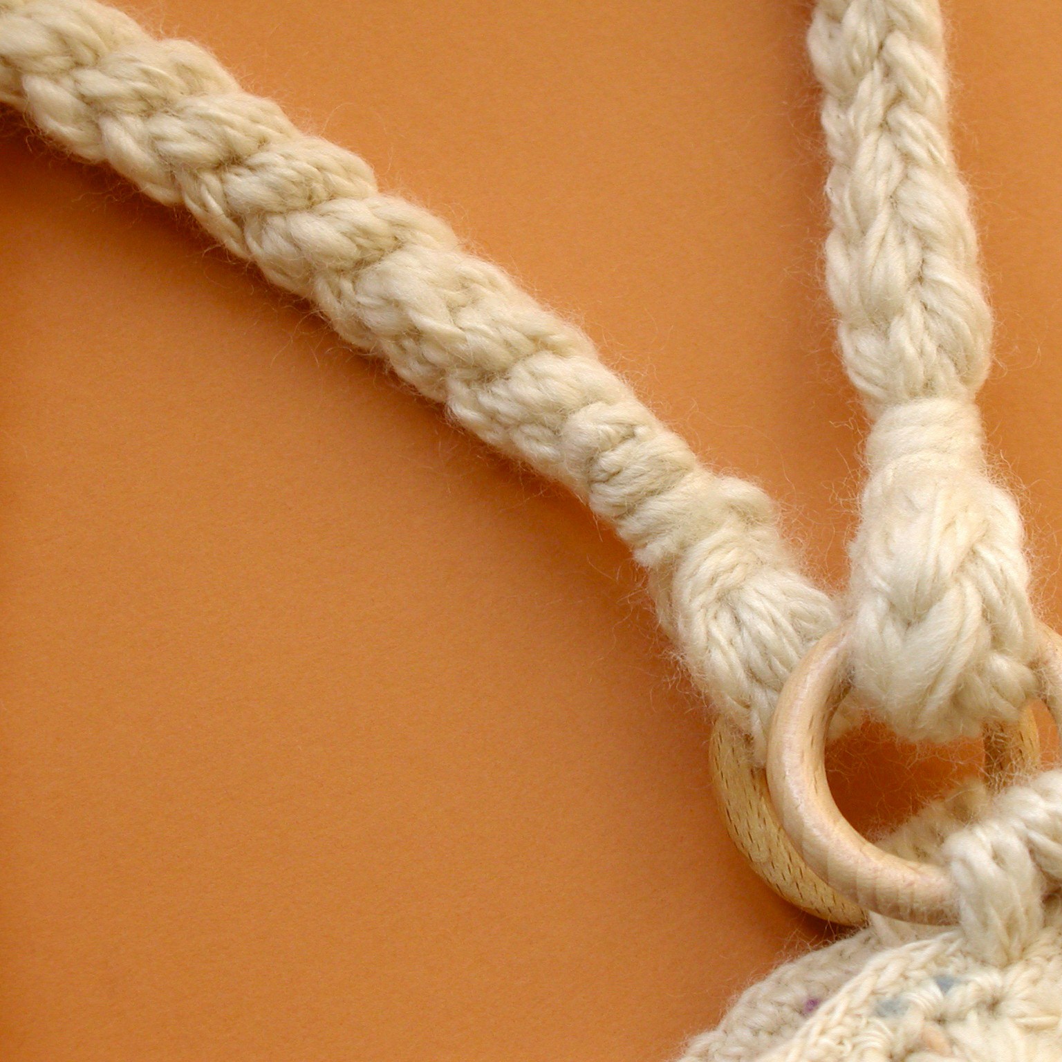 Made of 154 egle’s chunky squares made with Préalpes du Sud pure wool yarn in natural color and commercial fancy yarn odds and ends, joined in pairs and crocheted together with natural color Bluefaced Leicester pure wool yarn. Both yarns has been handspun by me with a drop spindle – the yarn scraps come from high quality commercial yarns, angora wool free. The handles have been connected to the body of the bag by light natural wood rings, 4 cm diameter.
