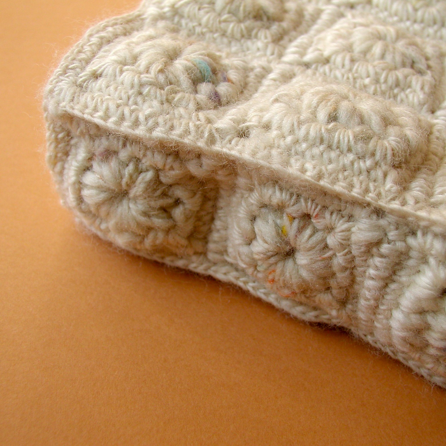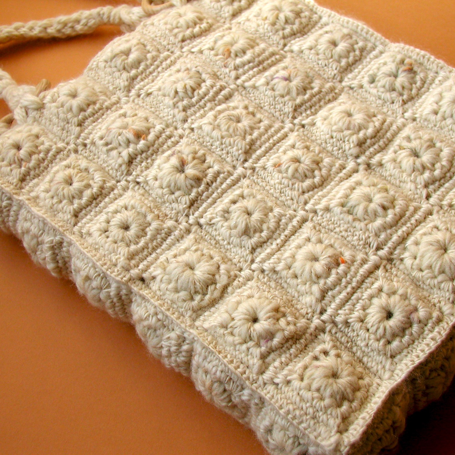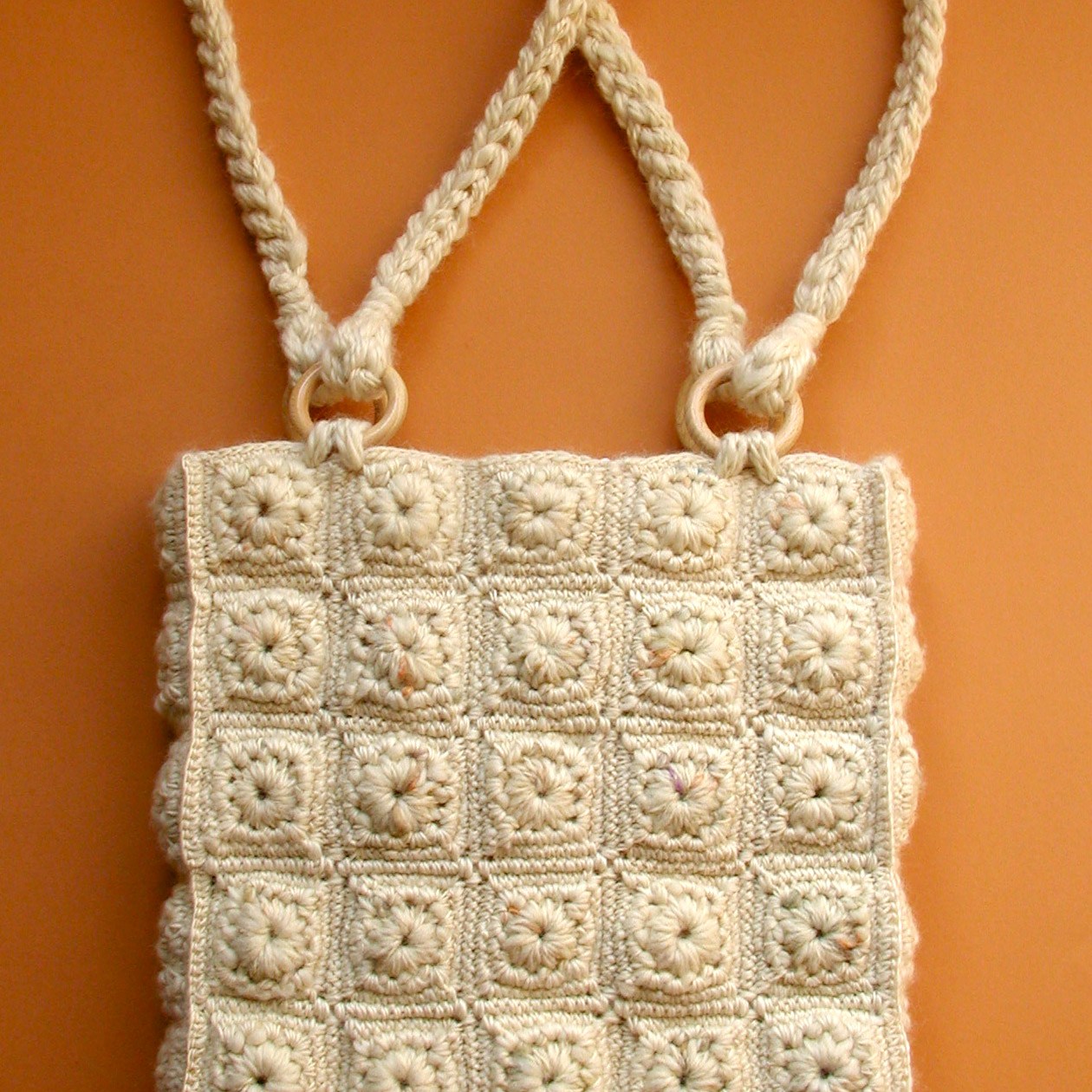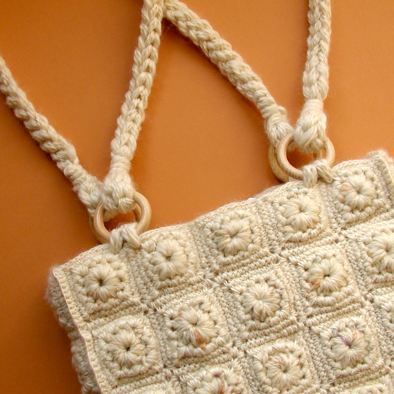 Made of 154 egle’s chunky squares made with Préalpes du Sud pure wool yarn in natural color and commercial fancy yarn odds and ends, joined in pairs and crocheted together with natural color Bluefaced Leicester pure wool yarn. Both yarns has been handspun by me with a drop spindle – the yarn scraps come from high quality commercial yarns, angora wool free. The handles have been connected to the body of the bag by light natural wood rings, 4 cm diameter.